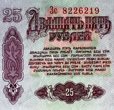 ソビエト連邦は15の連邦構成共和国から成っていたが、そのソ連の紙幣には金額をロシア語をはじめとする15の言語で表記してあるというのが特徴であった。右の写真は上の25ルーブル紙幣のその部分を拡大したもの。