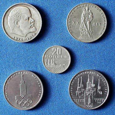 右の写真はメダルではなく、記念硬貨。大きいのは1ルーブルで、中央の小さいのが20カペイカ。右上は対独戦勝利20周年記念、左上はレーニン生誕100周年記念。このレーニンのは記念硬貨にしては大量に流通していて買い物のお釣りで渡されることも珍しくなかった。下の2枚はモスクワ・オリンピック記念。中央の巡洋艦「オーロラ」をデザインしたのはソビエト蜂起50周年記念硬貨。