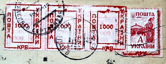 ソ連崩壊後の社会的・経済的混乱に伴う物価の急騰に切手の印刷が追いつかないという事情は旧ソ連のどこでも同じだったようで、当局はさまざまな形で当座の対応を迫られたらしい。上の写真はウクライナ共和国ニコラエフ市からの手紙に貼られていたもので、右端は正規の切手だが額面が数字では書かれておらず料金値上げに「柔軟に」対応できるようになっている。それ以外のは郵便局で発行するように証紙のようにも見えるが受付局や受付日がなく、しかも消印で消されているから臨時切手と見たほうがいいだろう。1995年1月に受け取った手紙で、通貨単位がルーブルでなくなっていることも臨時切手の印刷からわかる。