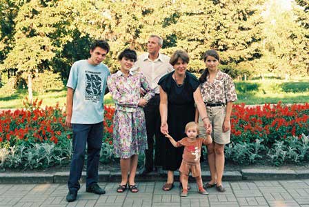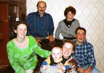 その後はイルクーツクに寄る機会がある度にお宅を訪ね、母子家庭ではないこともわかった。右の写真は上から10年余り後のもの。人数が増えているのはアントンのお父さんが写っているからだけではない。 (1994年8月撮影)
