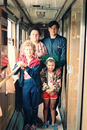 長距離列車での旅や船旅だと他の乗客と一緒に時を過ごすわけだからどうしても仲良しになる。写真は、第2章「子どもたち」に登場するリューダの家族。モスクワ経由でベラルーシのミンスク州の自宅に帰るところ。急行列車の車内で撮影した。 (1991年8月撮影)