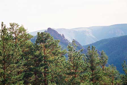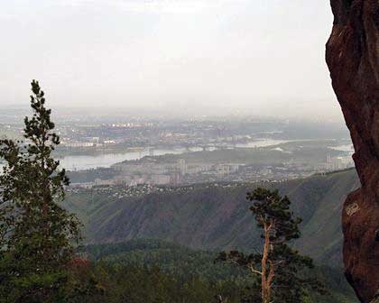 市のすぐそばにある景勝地ストールビィ国立公園から見たクラスノヤルスク市の中心部。 (1999年8月撮影)