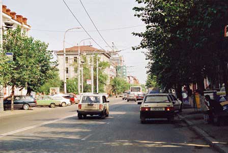 これらの正面が「文化と休息の公園」で市民の憩いの場になっている。(1999年8月撮影)駅前広場で見かけたクワス売りのタンク車。