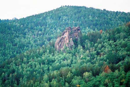 ストールビィ国立公園の風景。遠くまで続くタイガの中に様々な形をした奇岩が顔を出しているのが特徴。下段左は公園内の遊歩道、同右は園内のリフトから市街地を遠望したもの。 (1999年8月撮影)