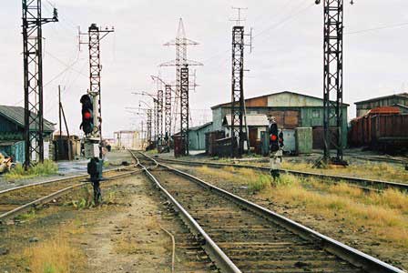 ロシアでもこれほど北のほうで鉄道が走っているところと言えば、ムルマンスク方面とここしかない。ただし、こちらの鉄道は全国にはつながっていなくて、ノリリスクとここドゥヂンカを結んでいるだけ。貨物列車の他に旅客列車も運行している。 (1999年8月撮影)
