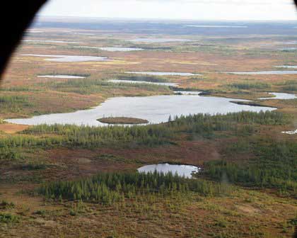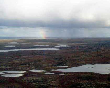 ヘリコプターの窓から撮影したツンドラの風景。おびただしい数の湿地と小河川、灌木林か疎林以外は草地か裸地というのが特徴だ。上段中央の写真では、遠くにかすかに虹の出ているのが見える。 (1999年8月撮影)