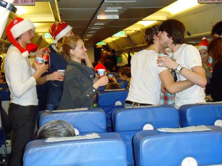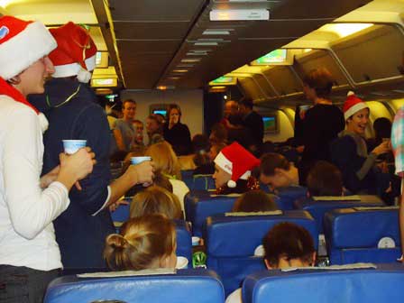 大晦日にモスクワを発つ東京便に乗り合わせたら、夕食が済んでもみんな静かに寝たりはせず、東京時間の午前5時を待って、一斉に「ス・ノーヴィム・ゴーダム」! アエロフロート側もよく心得ていて、乗客にシャンペンを振る舞ったりしたから、騒ぎは、しばらくはおさまらなかった。 (2012年1月撮影・モスクワ発東京行きアエロフロート機内)