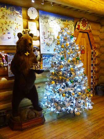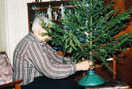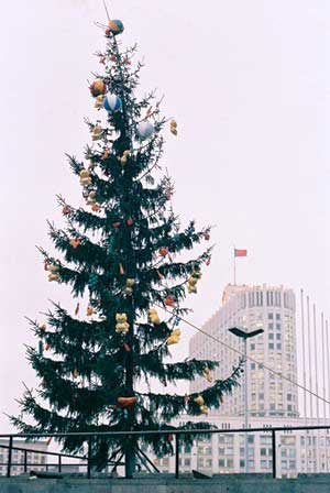 ヨールカは町の広場やイベント会場だけにあるのではなく、かつての日本で家ごとに門松を用意したように、それぞれの家庭でも樅の木に飾り付けをして新年を待つ。この時期、おびただしい数の樅の木や大ぶりの枝が市中に持ち込まれ売られる。樅の木を立てるスタンド(重し)や色のついた飾り玉などももちろん市販されていて、どの家庭でも備えている。 (1996年12月撮影・サンクト・ペテルブルク)