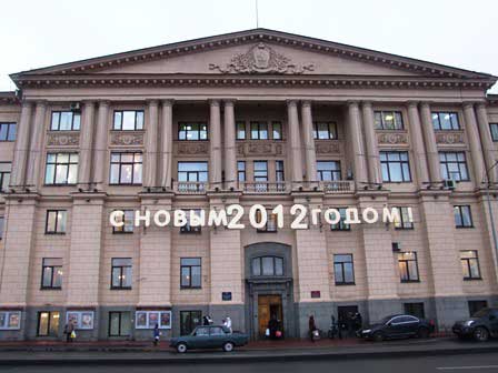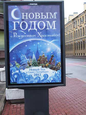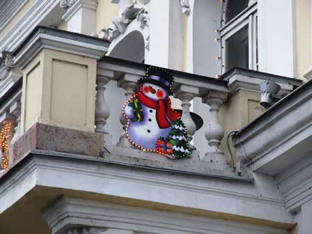 新年が近づくと、公共の通り・広場は言うに及ばず、公私の建物にも、このような装飾が施される。 (上段:2011年12月,下段:2016年12月撮影・いずれもサンクト・ペテルブルク)