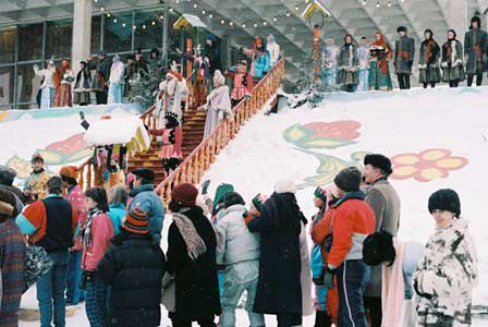 この時期、厳寒の屋外でも子供たちのため、あるいは大人達のための新年を迎えるイベントが頻繁に行われる。そこに必ず登場しなくてはならないのがマロース爺(ヂエト・マローザ)と雪娘(スネグーロチカ)だ。写真はレニングラード郊外で行われたもの。 (1986年12月撮影)