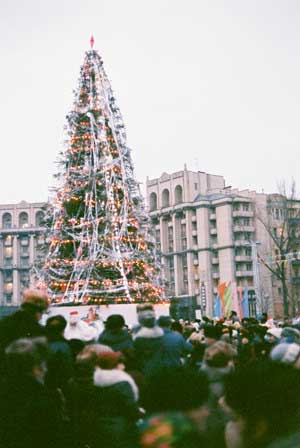 キエフ市の中心部の広場に据えられた樅の木。新年のデコレーションがされている。 (1988年1月撮影)