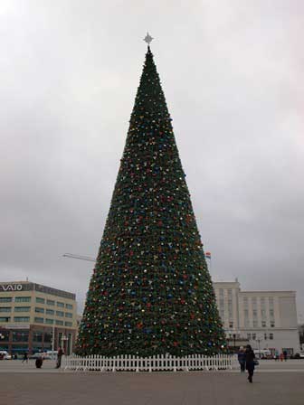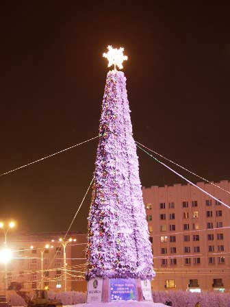 市の中心部にある広場に立てられたヨールカ。ライトアップされていて、しかも光の色が絶えず変わるようになっていた。 (2005年12月撮影・ムルマンスク)