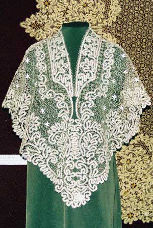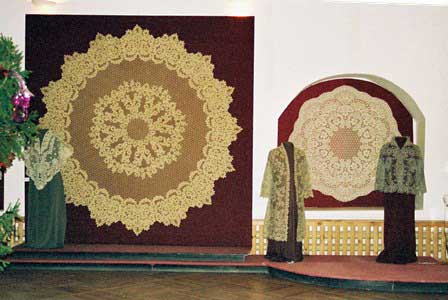 ヴォログダは麻糸で編んだレースで有名。すぐれた作品は市で買い上げてこのように博物館に展示される。 (2000年1月撮影)