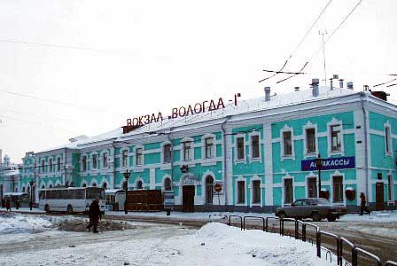 プスコフの鉄道駅と同じようにきれいな色だ。プスコフのそれと違って駅舎の広場側に「ヴォログダ」の表示があるのは、市内に第一駅と第二駅のように複数の駅がある場合が多い。写真はヴォログダ第一駅で、遠距離の旅客はみなこちらを利用する。 (2000年1月撮影)