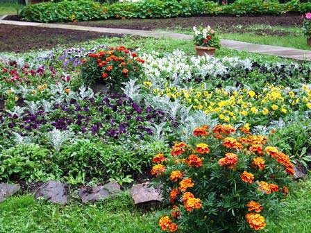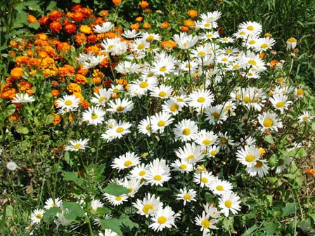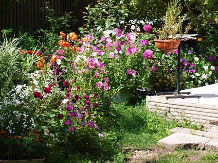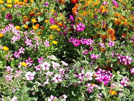 ロシアのどこへ行っても、花壇がよく手入れされている。この写真はバイカル湖畔リストビャンカ村で撮ったもの。上の2枚はホテルの前庭。左の1枚は村の教会の境内。 (2011年8月撮影)