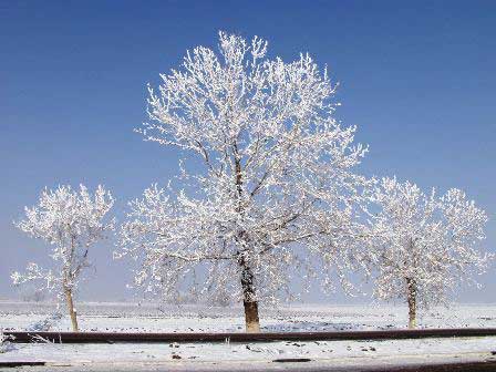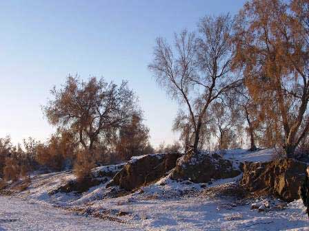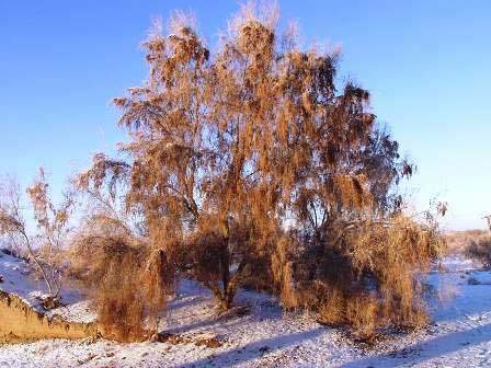砂漠地帯の街道脇の樹木が低い朝日を受けているところ。 (2007年1月撮影・ブハラ〜シャフリサブス間)