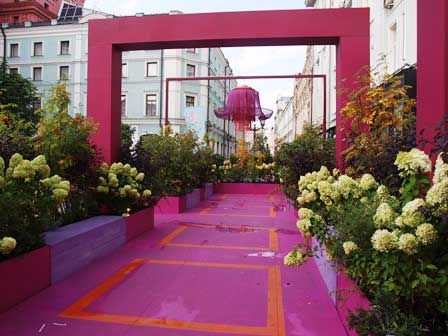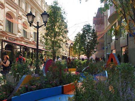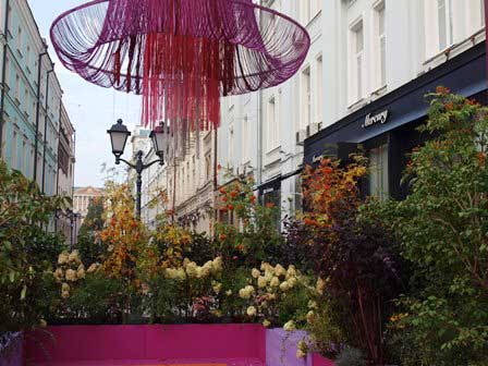 モスクワのかなり中心部で撮った写真。きっと何かのイベントだったのだと思うが、通りが草花で埋め尽くされていた。 (2018年8月撮影)