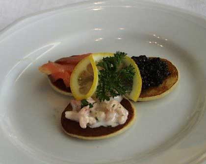 左の写真は前菜(ザクースカ)。これまで見たこともないような可愛らしいブリヌィ3枚のそれぞれにシュリンプのサラダやキャビアを載せてある。 (1999年8月撮影)