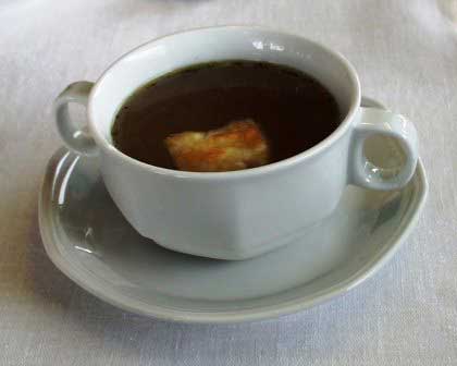 キャプテン・ディナーのようなきちんとした食事の時は、ロシアでは必ずコース料理で、ザクースカに次いで出されるのが「第一の皿」と呼ばれるスープ。ロシアのスープで私の口に合わなかったものはない。有名なボルシチをはじめ、シー、サリャンカなどどれも好きだ。写真は、おそらくブィヨン。