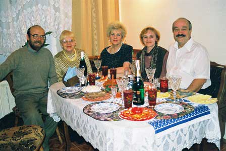 ヴォログダ市内のある家庭に客人を招いての新年パーティー。宴はまだ始まっていなくてここでもテーブルにはシャンペンとザクースカだけが並べられている。しかし、上の写真でもそうだが、このザクースカというのが日本のロシア料理店のそれとは違って種類・量ともに豊富で、その後にスープやメインディッシュを出されても口に入れるのさえ難しいほどだ。それはホスト側でも心得ていて、スープ以下は省略されることもある。 (1999年12月撮影)