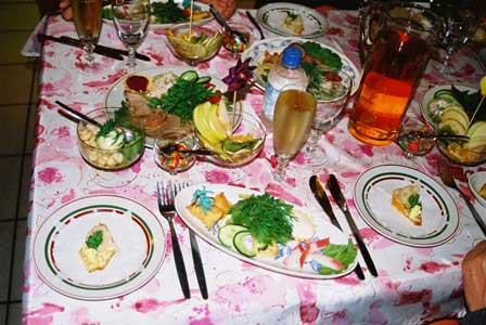 カレリアの首都ペトロザボーツク市内にあるレストランでの昼食のテーブル。飲み物とザクースカだけが並べられている。飲み物は白ワインとコケモモか何かのジュース。私が食卓の前にいる人たちではなく、食卓の上の料理だけを撮った珍しい写真。 (1998年8月撮影)