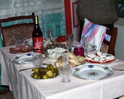 ロシアの家庭に招かれて「お茶にしますか?」と聞かれたら、紅茶にクッキー程度の軽いものだと思って返事をしてはいけない。多様なザクースカがウォトカなどのお酒と一緒に出てくるのが普通だからだ。自家製のピクルス、チーズをふんだんに使った前菜類、サラダ、鶏か魚料理、それに温野菜やソーセージなどのことが多い。 (2001年1月撮影)