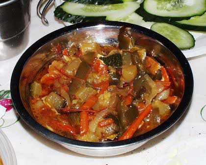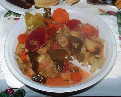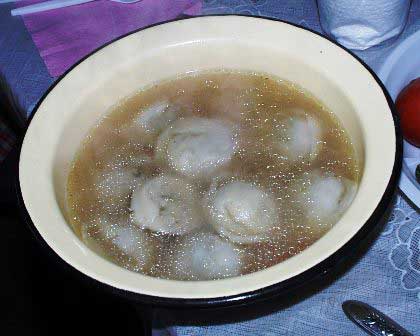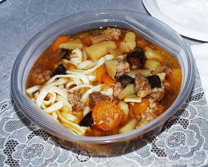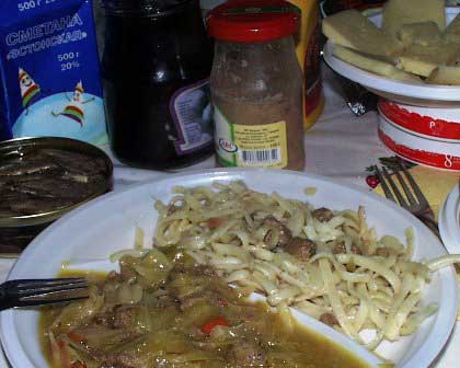 2000年夏のカムチャッカ旅行ではホテルだけでなく山小屋にも泊まる旅程であった。小屋にレストランはないから、現地の旅行会社が身内の主婦を調理人として付き添わせた。おかげで、我々は小屋で生活している間中「お袋の味」を振る舞われ続けたわけで、これがめっぽう美味しく、この時の旅行で食事について文句を言う客は一人もいなかった。左の写真は、ボルシチに見えるが、ご当人の説明だと「モスクワ風シチー」だとか。 (2000年8月撮影)
