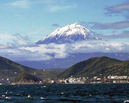 アヴァチャ湾内から見た州都ペトロパヴロフスク・カムチャツキー。背後に富士山のような形の火山が見えるが、これがカムチャッカの風景の特徴かもしれない。 (2000年8月撮影)