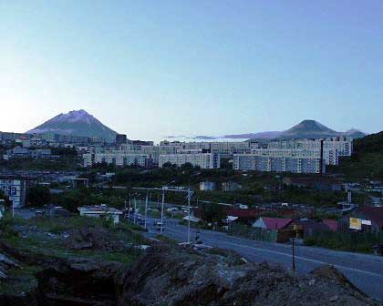 カムチャッカには火山が非常に多くあり、ペトロパヴロフスク・カムチャツキー市には火山大学があるほどだ。市内のいたるところから北方や南西方向に富士山のような形をした火山を見ることができる。写真は日没時に市内から見たコリャク火山(左)とアヴァチャ火山(右)。 (2000年8月撮影)