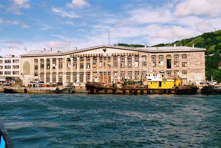 港の背後はすぐに小高い丘になっているので、その丘と海との間の狭い斜面に住宅やオフィスが並ぶ形になる。もちろん丘の背後にも広い市街地が広がっているのだが、海からはそれは見えない。 (2000年8月撮影)