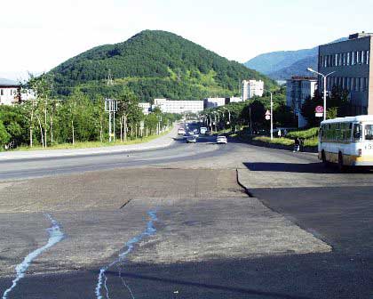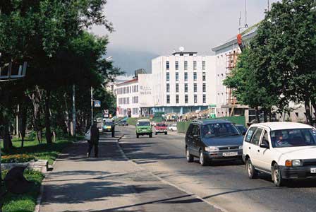 ペトロパヴロフスク・カムチャツキー市内中心部の通りの一つ。御多分に洩れず、走っている車は右ハンドル車が圧倒的。 (2000年8月撮影)