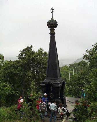 19世紀半ばのクリミヤ戦争の際、ロシア海軍の基地のあったここペトロパヴロフスクにも英仏の連合艦隊が攻撃をしたのだそうだ。その記念碑がニコリスカヤ丘の麓と中腹にあった。私はクリミヤ戦争というからクリミヤのセワストーポリとかそのあたりだけが戦場になったとばかり思ってい込んでたのだが、こんなとんでもないところでも戦闘があったのだ。 (2000年8月撮影)