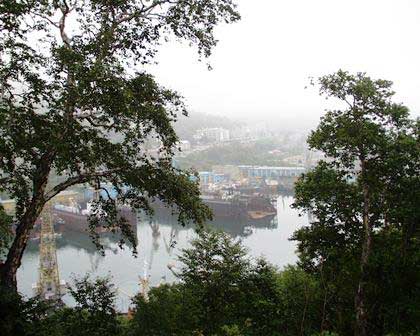 海港ターミナルのすぐ近くにも高さ100mほどの「ニコリスカヤ」という小さな丘がある。そこから見下ろした港の一部。右の写真は、同じ丘から向かいの丘の斜面にならぶ住宅群を見たところ。 (2000年8月撮影)