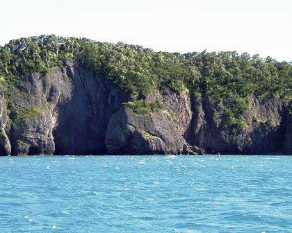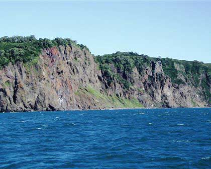 アヴァチャ湾の湾口は比較的狭く、港に適した入り江と言える。その湾口に近い部分の岸は両側とも切り立った崖になっていて、海水浴場になりそうな砂浜は見あたらない。 (2000年8月撮影)