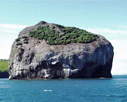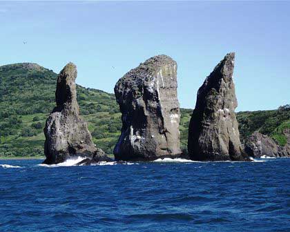 湾口に近いところにあってアヴァチャ湾のシンボルとも言われる岩。真ん中のが人面岩に見えなくもない。 (2000年8月撮影)