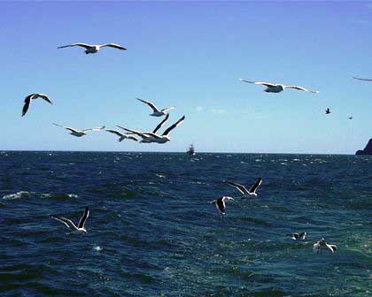 やはり比較的湾口に近いところに上部がなだらかな斜面になった岩が海面から突き出ていて、そこに無数の海鳥が群がっていた。 (2000年8月撮影)