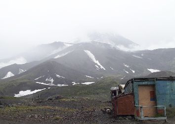 アヴァチャ火山の山麓にある登山者用の小屋のあたりからアヴァチャ山の方向を見た写真。天候が悪く山はよく見えなかった。写真の右端に少しだけ見えているのが我々が泊まった小屋で、暖房はもとより、小窓が一つしかないのに照明もなく我々は「監獄」だの「収容所」だのと言ったものだ。 (2000年8月撮影)