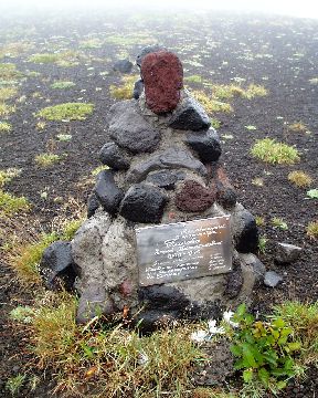 私は別段登山をしにこのあたりに来たわけではなく、高山植物の咲くあたりをハイキングするのだという旅行社のパンフレットに誘われてやってきただけだったのに、歩き始めてまもなくこんなケルンに出会って「え、そういう山なの」と認識を改めた。若くして亡くなった女性に対する家族の思いが切々と伝わってくる。 (2000年8月撮影)