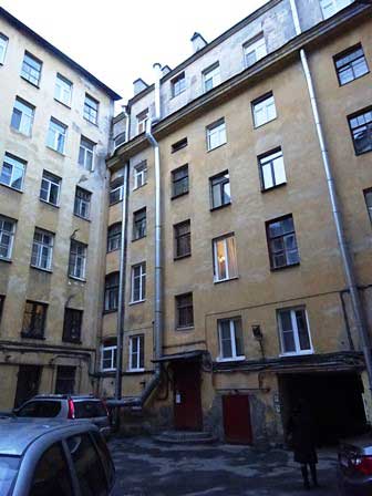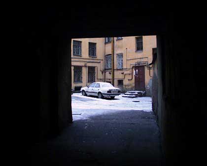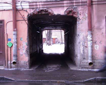 小説ではあちこちで「中庭」とよばれる場所が大切な役目をしているようにも見えるが、それはこのように表通りから建物に開けられた暗いトンネル状の通路を入っていってそれを抜けたところにある。ソ連時代には、ここで子ども達が遊んだり年金暮らしの老人達がおしゃべりをしたりしていたものだが、今や年金生活者はそんなことをしていられる状況ではなくなって、そういう光景も陰をひそめてしまった。