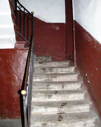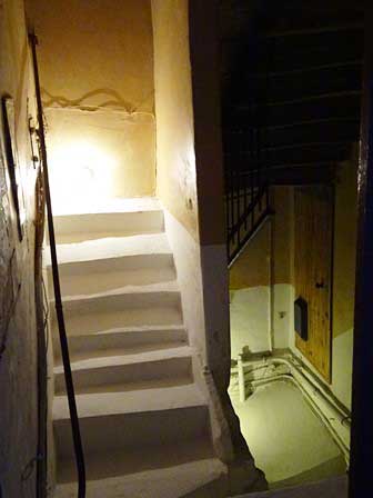 「《裏階段》といった感じの、暗く狭い階段だったが、そんなことはとうに研究ずみだったし、むしろこういう状況が気に入ってもいた。」 (左:2000年12月,右:2017年1月撮影)