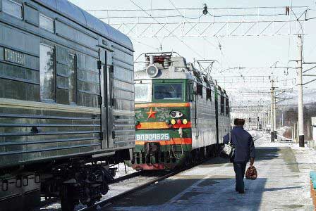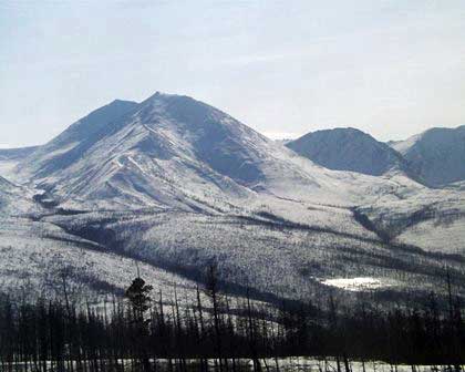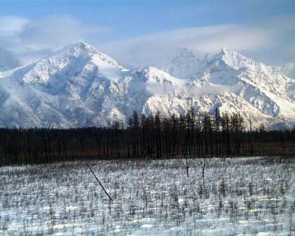 コムソモリスクを発ってからひたすら林の中を走ってきた感のあるBAM鉄道だが、このあたりから景観が変わる。鉄道の北側に雪をいただいた山脈が続くのだ。このあたりのアルピニストは、この山の中を10日も20日もかけて縦走するのだという。 2枚とも、走行している列車の中から撮ったので、少し鮮明さに欠けるのをお許しいただきたい。 (2001年3月撮影)