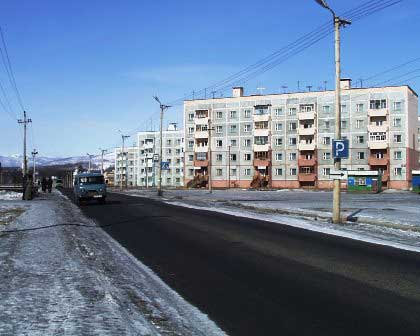 タクシモ駅前の通り。何棟かのアパートがじゅうぶんな間合いを取りながら並んでいるだけ。商店も簡単には見つからないという雰囲気で、日本での感覚からすると「駅前通り」と呼ぶのも躊躇するほどだ。 (2001年3月撮影)