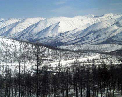 タクシモを過ぎて1時間余り走ると左右の車窓にこのような景観を楽しむことができるようになる。そして、BAM鉄道の中でいちばんの峠越えにさしかかる。 (2001年3月撮影) 写真の中央に見える逆S字状の筋は私たちが乗った列車がさっき通ってきた線路。セヴェロムィスキイ・トンネルは最近貫通したばかりでまだ線路が敷設されていないので、こうやって曲がりくねった線路で峠を越えなければならない。 この写真の左端に少しだけ見える山の裾にあるのも線路。峠越えは鉄道関係者にとっては重労働だが、観光客にとってはこうしたすばらしい景観を眺められる時でもある。ロシア最長と言われるトンネルが使えるようになったら、この眺めは見られなくなる。