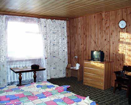 バイカル湖畔の林の中に建てられたペンションの1棟。外国人の旅行すべてをインツーリスト(国家外国旅行者委員会)が取り仕切っていたソ連時代とは違って、個人経営かそれに毛のはえた程度の零細な会社経営の旅行会社や宿泊施設がロシアにも増え始めている。こうした業者のうち良心的なのにあたると、家族的でほんとうに暖かいサービスを受けることができる。私が泊まったこの施設も、贅沢さはなかったけれど、設備ももてなしもまったく不満はなく、ことに手作りの食事がたいへん美味しかった。 (2001年3月撮影)