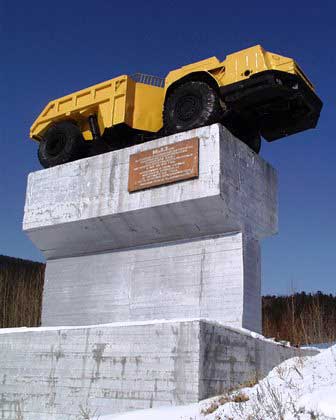 ロシアの鉄道技術者(線路の設計者)はトンネルを掘るのをできるだけ避ける傾向があるということをいつか聞いた記憶があるが、BAM鉄道の中でもこのバイカル北岸の区間だけはトンネルが集中している。ある程度の高さの山地から一気に湖岸に降りるというバイカル独特の地形のせいであろう。そのトンネル工事に従事した労働者を称える記念碑が湖岸のトンネル脇にあった。 (2001年3月撮影)