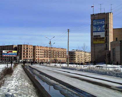 セヴェロバイカリスク市中心部の通りの一つ。 (2001年3月撮影)