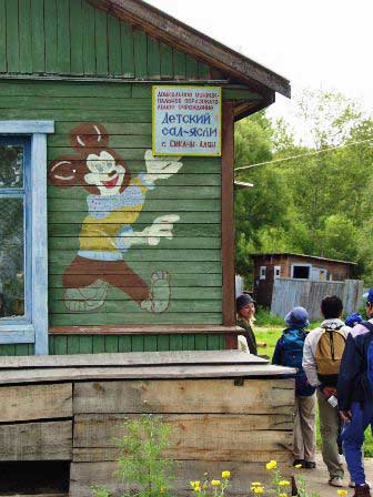 村の幼稚園とそれに隣接する小学校。右の写真ではよくわからないが、木造の小さな学校のこれまた小さな庭には色とりどりのコスモスのような花が咲き競っていた。 (2002年8月撮影)