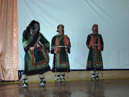 観光客の前でナナイ族に伝わる民族舞踊を披露する少女たち。 (2002年8月撮影)