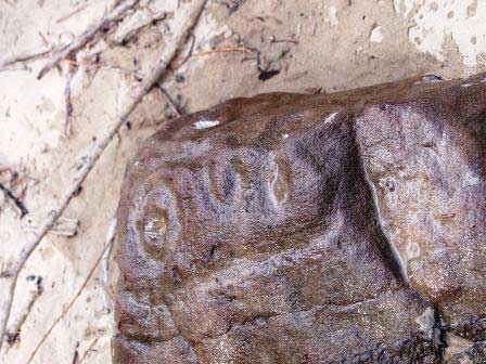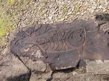 この村には、古代人が岩に描いたという絵が残っていることで有名。河岸にゴロゴロ転がっている何の変哲もない岩に描かれているので、どうして長い年月の間に風化して消えてしまわなかったのだろうかと驚く。左は人面、右がトナカイということだが、写真でもそう見えるだろうか。 (2002年8月撮影)