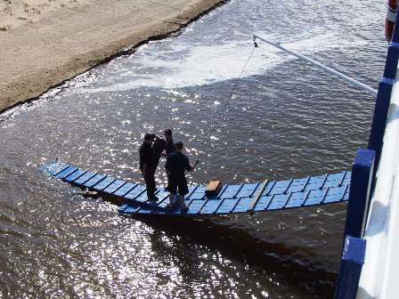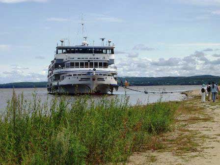 ロシアの河川クルーズのではスケジュールの中に「グリーン・ストップ」というのが組まれるのが通例だということは第10章「ボルガ」のところにも書いた。文字通り緑の中に乗客を解放する。でも、港へ船をつけるわけではないので、備え付けの救命ボートによるピストン輸送で乗客を運ぶとか、あるいは用意してきた渡し板をつないで通路にするとか、とにかくスタッフ側の苦労は並大抵でない。右の写真はグリーン・ストップを終わって船客を船に収容した後で渡し板の撤収作業をする乗組員。 (2002年8月撮影)